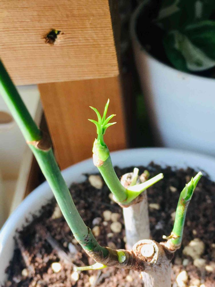 葉っぱも枯れてしまいサヨナラしようかと迷いつつ置き場所変えてお水控えたら出てきましたよ〜🌱✨(*⁰▿⁰*)