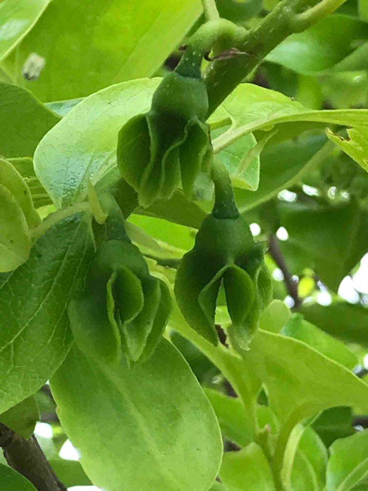 買い物散歩道傍の柿畠(果樹園)、若葉の中に柿の花。もう受粉完了かな?
