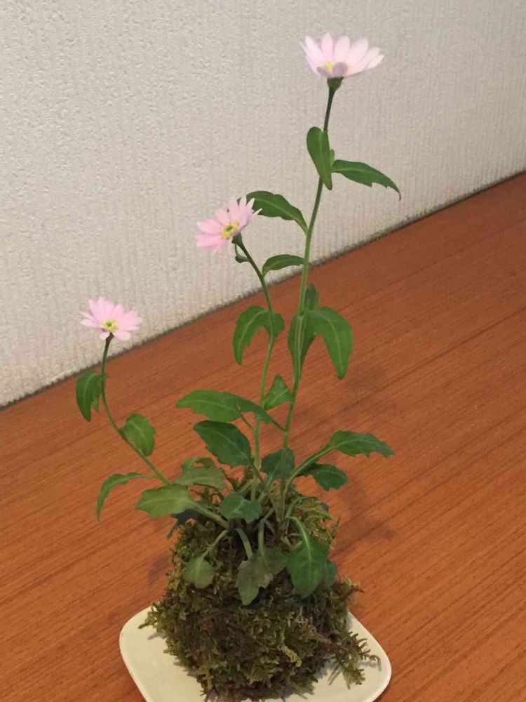 花壇の都忘れを三本抜いて、苔玉にしました。苔はハイゴケです。