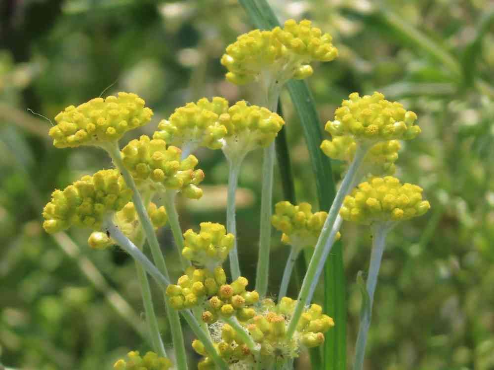黄色い小さな花がつぶつぶになって固まって咲く。花(頭花)は真中にある筒状の両性花と、周りにある糸状の雌花からなる。