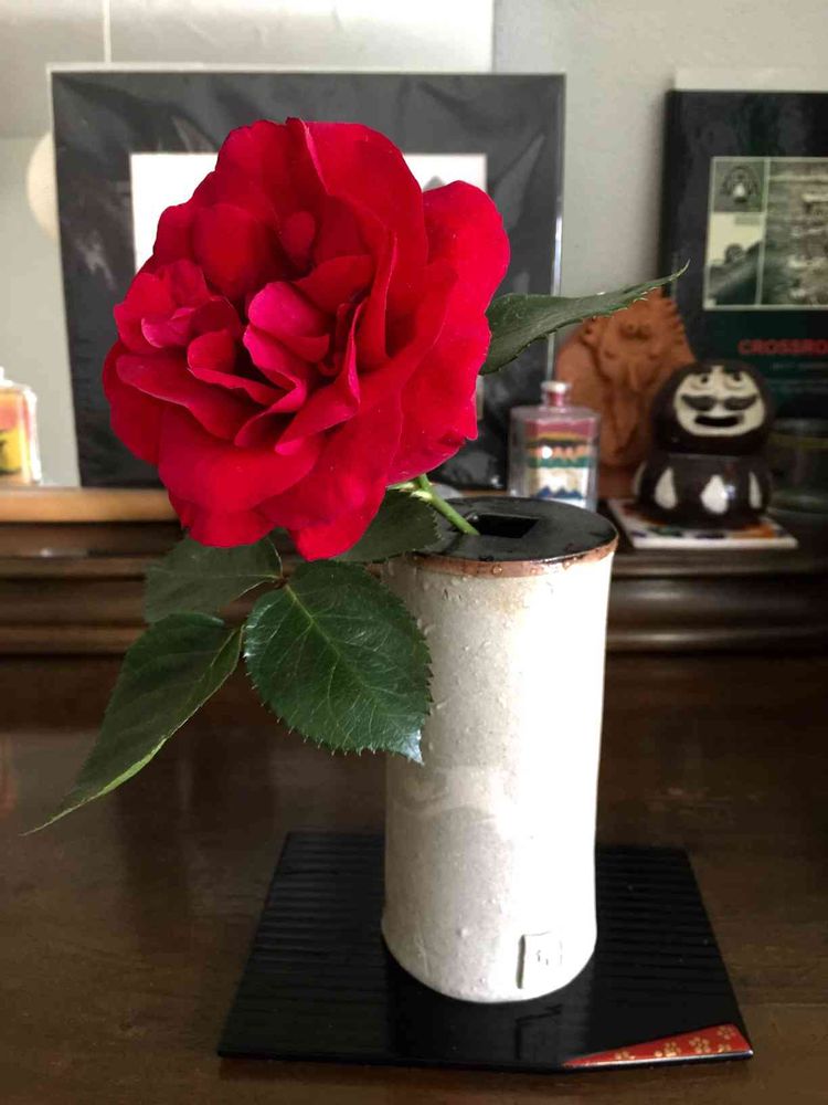 前庭の薔薇🌹随分咲いてきたので一輪家にも。自作の器に。