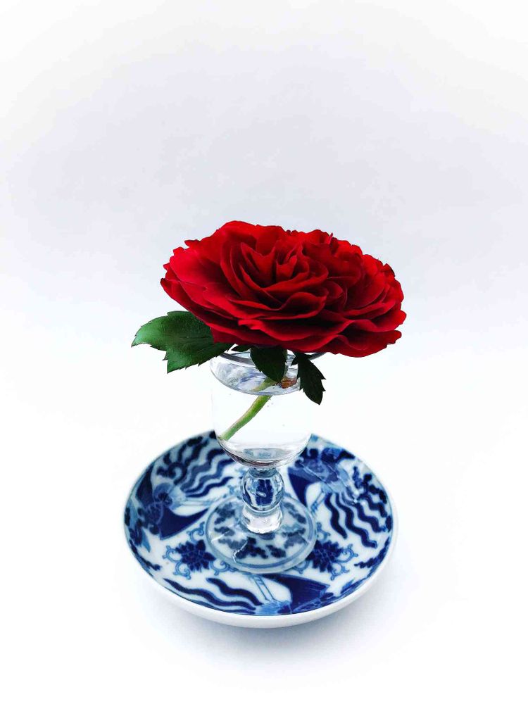幹から直接ステムがでて花を咲かせてしまった、レッドレオナルドダヴィンチを藍の小皿と合わせてみました♪
