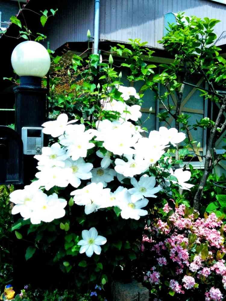 散策の通り道のお宅の玄関前に、咲く白いクレマチスが満開です。