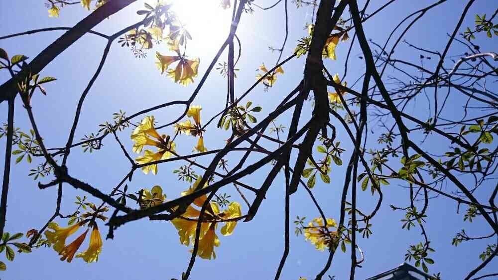 春の青い空に、明るい黄色の花がきれいでした~💕