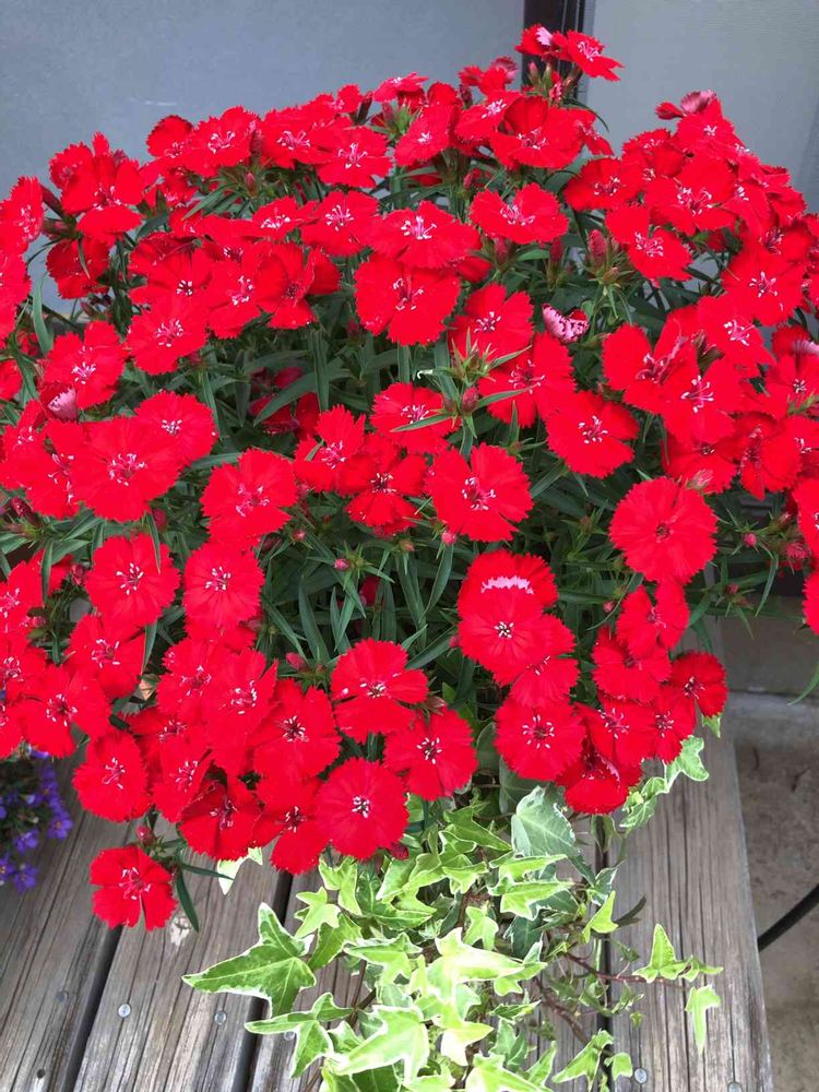 ピンク、薄ピンク、レッドの三色植えの小さなナデシコが、結局真っ赤だけ生き残り、早3回目の春を迎えました