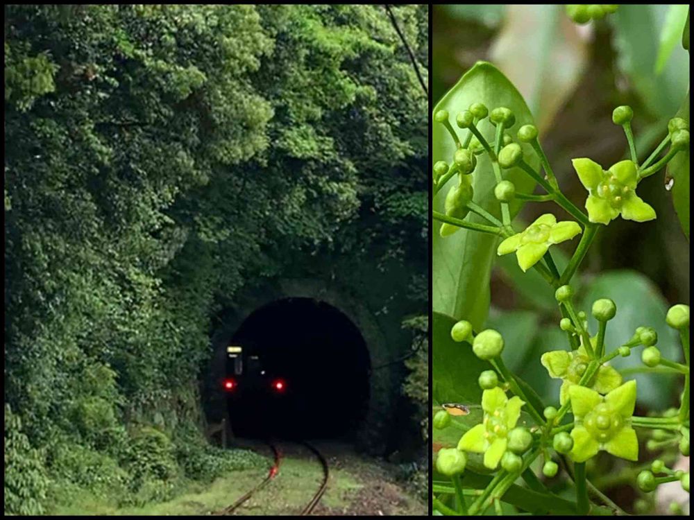 クスノキの花と、クスノキの丘に掘られたトンネル。