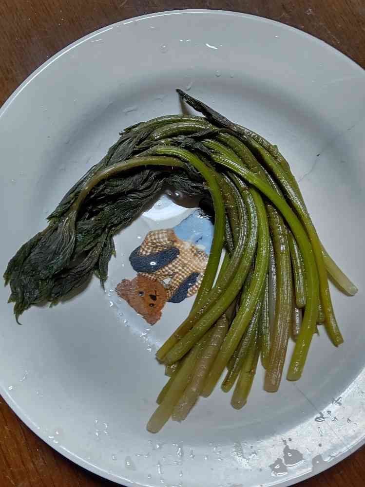 山菜の中で一番のお勧め、アイコ、茎の薄皮を剥いて、完成です。😊味塩で少し塩分を含ませて根元から、ポリポリ、葉っぱにも塩分が含まれているため、最後の締めくくり、微妙なショッパさ、で一本完食です。🤩😍😊たまりません!癖になります。