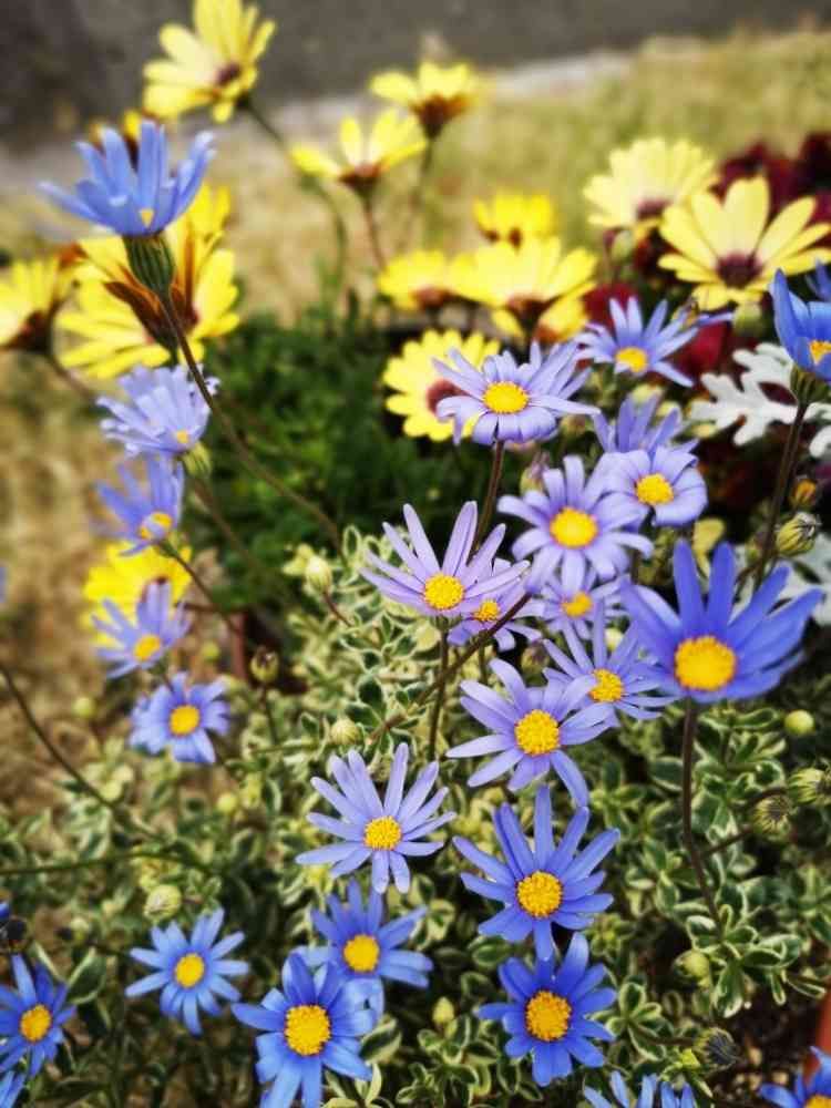 斑入りのブルーデイジー、オステオさんに負けじと元気に咲いています😊