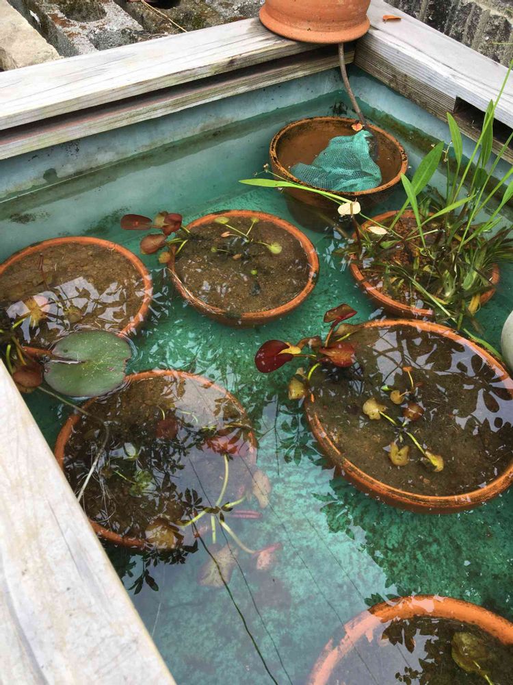 トロ箱池、やっと泥掃除。睡蓮の植え替えは今度。メダカの稚魚がチラホラ。