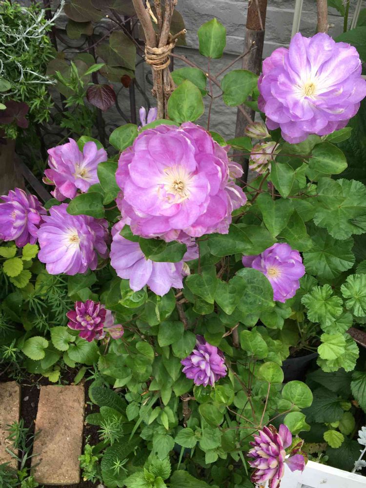 鉢植えのクレマチスは、4本の剪定枝でお庭のアイビーをクルクル繫ぎ支えて貰っていますよ💕
