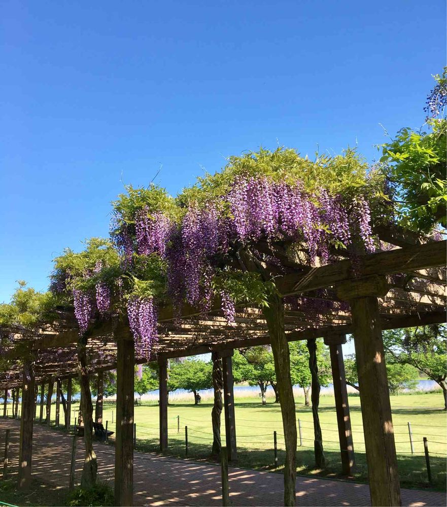 近くの公園に藤を見に行って来ました。青空と藤の紫が綺麗でしたo(^▽^)o