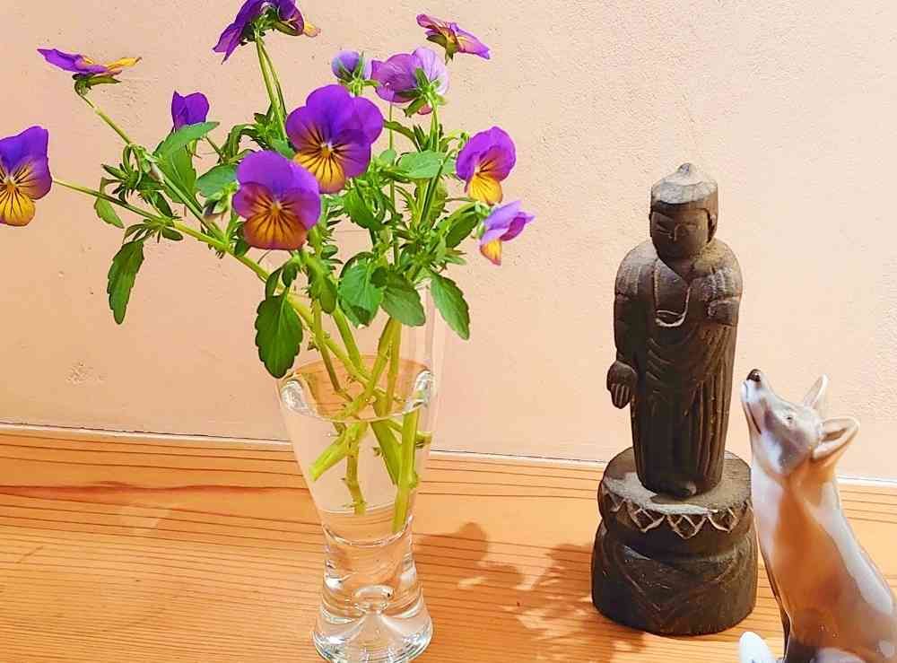 庭から摘んできたお花で如来ちゃんとキツネチャンとお花見してもらいました。
