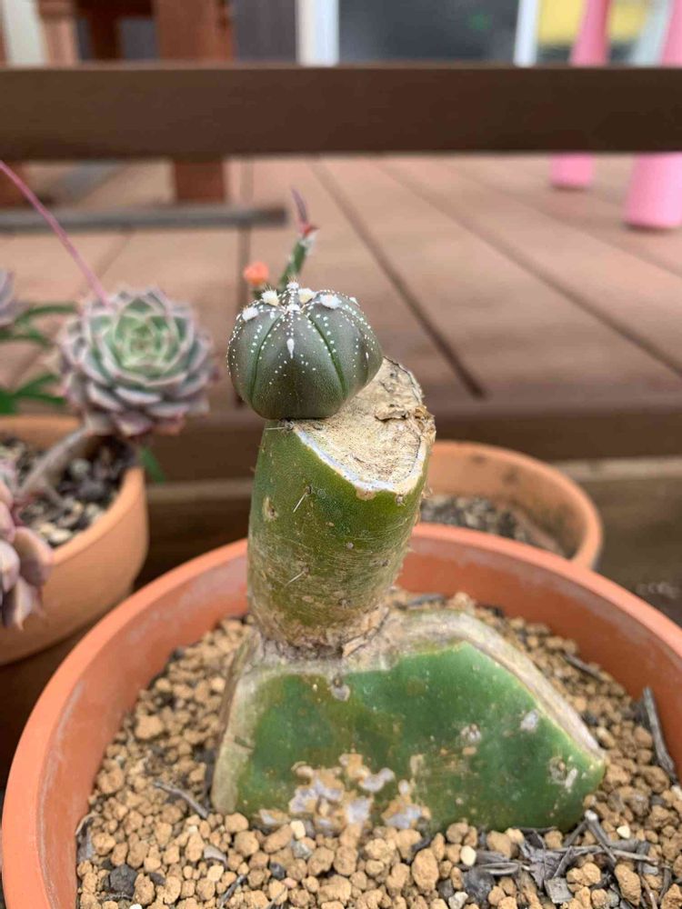ウチワサボテンに接いだ兜が育ってきました。成長の遅いサボテン なので、接ぎましたが、それでも遅いですね🥴