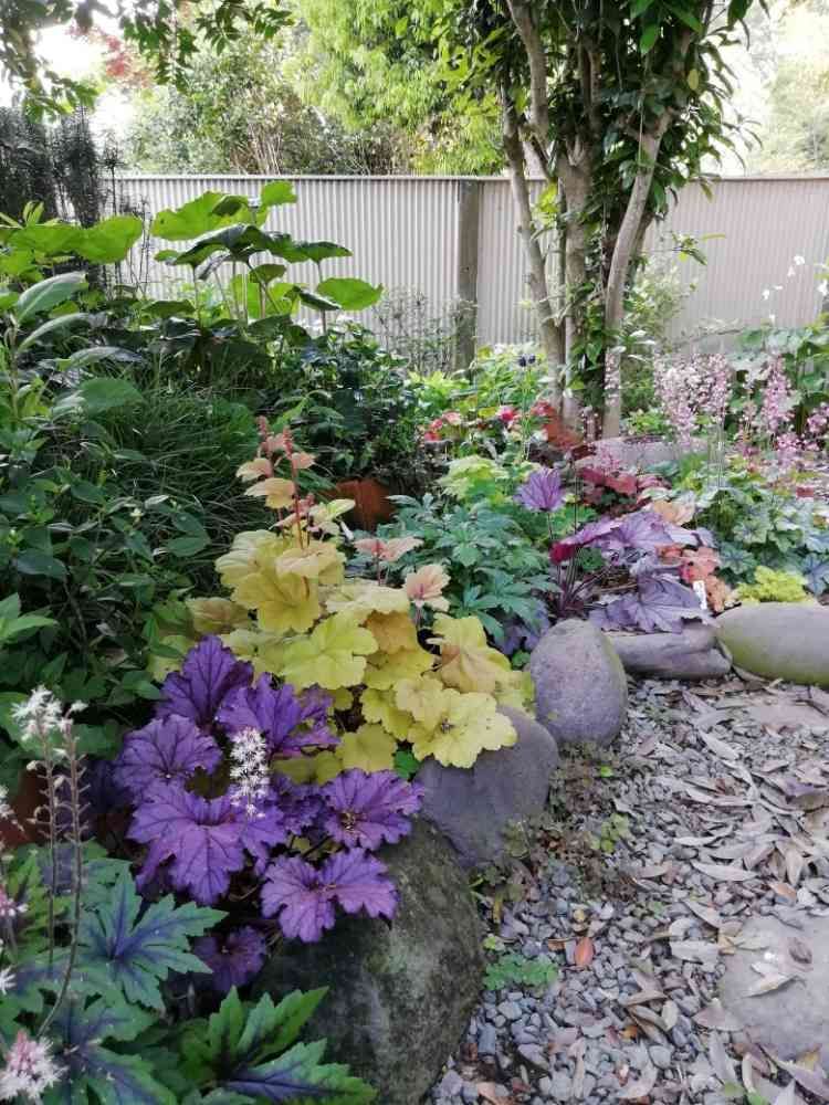 シェードガーデンのヒューケラ、ヒューケレラ、ティアレラがモリモリで鮮やかな色に❗🎶