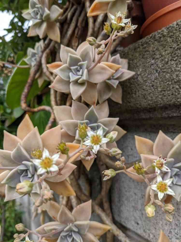民家の塀から垂れ下がる朧月と可愛い花🌼