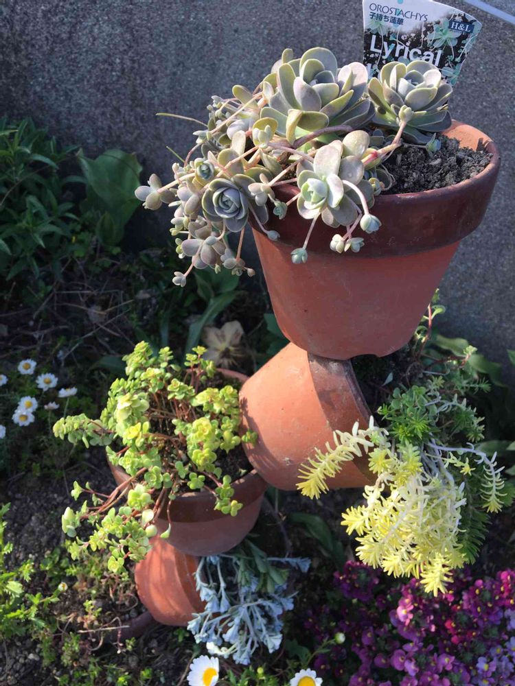 土に突っ張り棒を突き刺して、交互に植木鉢を傾けて、植木鉢タワー🗼を作ってみました!