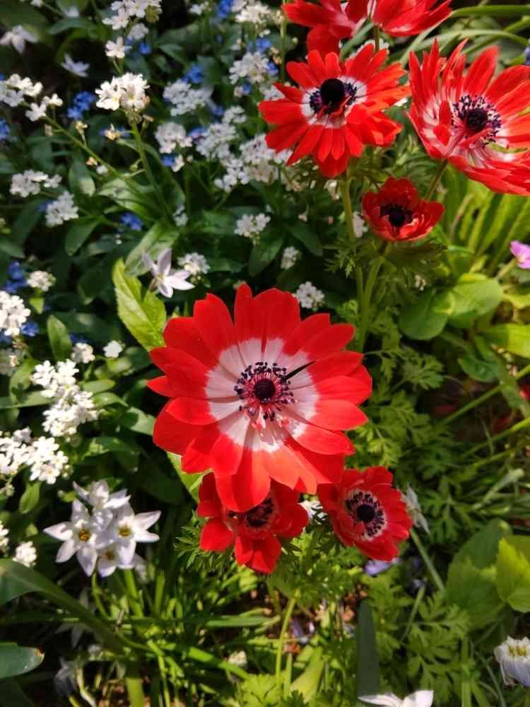 鮮やかな赤と白のアネモネ、背景の緑とマッチしてとっても素敵ですね😀