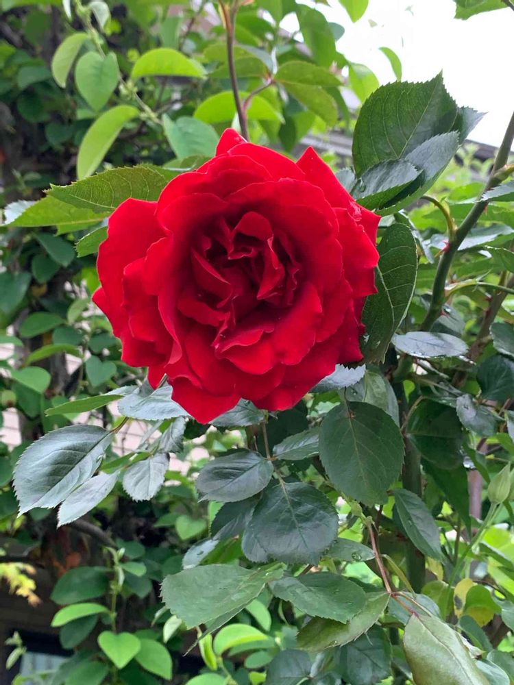バラ ダイナマイトの🌹の一輪めが咲きました☺️ちょっとダークな赤い色がキレイです。葉も濃い緑の照り葉で、花の色に合っています。