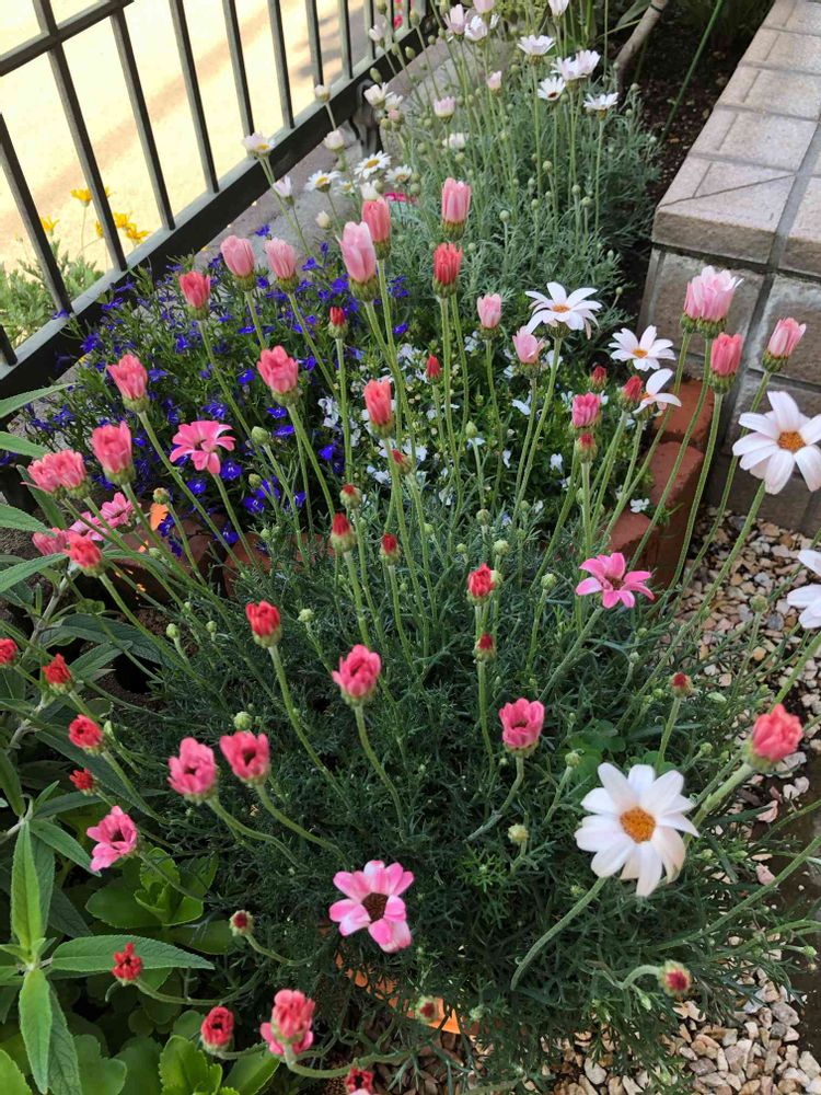 サフィニア、ペチュニアやマーガレットを玄関側には植えてます。可愛い感じのローダンセマムも気に言ってます。ちょっとずつ、名前が違うの💕❤️