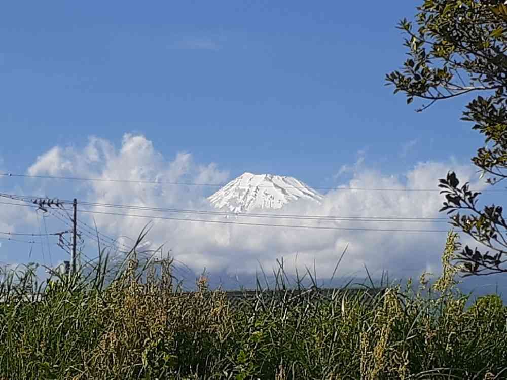 富士山、こちらからもよく見えるんですよ。空気が澄んでないのかぼんやりでした。雲から頭を出した富士山残念
