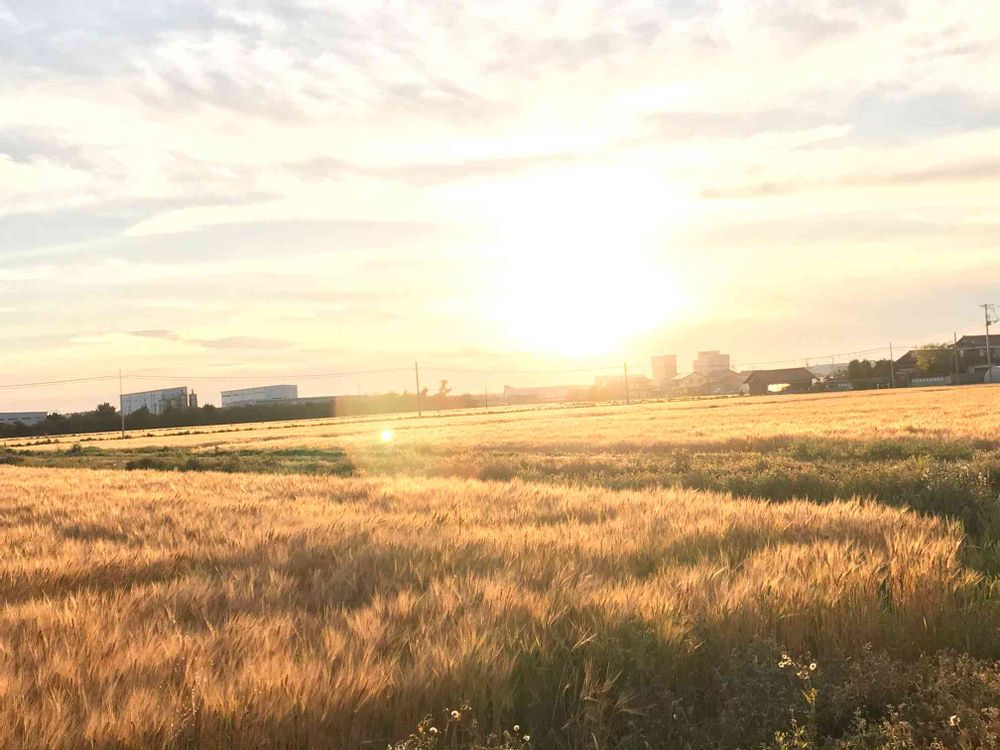 ✨ウォーキング途中は水田の夕陽。帰ってくると家の前は麦畑と夕陽☀️✨