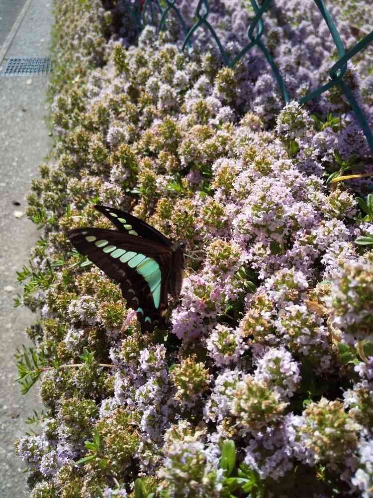 タイムの絨毯に艶やかな黒とブルーの蝶が何匹も遊んでいました!…美味しいの…蜜💛🎀💫🎶🤗…