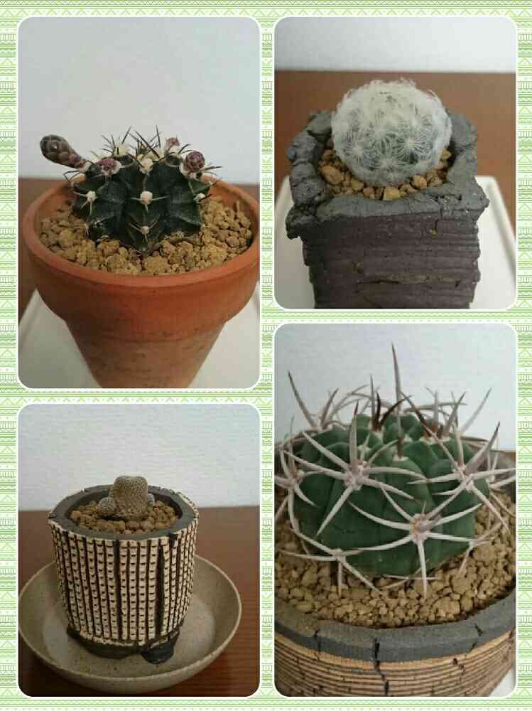 応天門の針が外に開き、内側の針が伸長中。大きいサボテンは動きも大きいです。ヘリオーサはお気に入りの鉢に植え替え。
