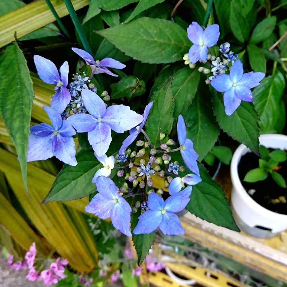 真ん中の両性花が咲く頃にはちょっと薄まってくるので、この咲き始めの濃い青が好き🙆