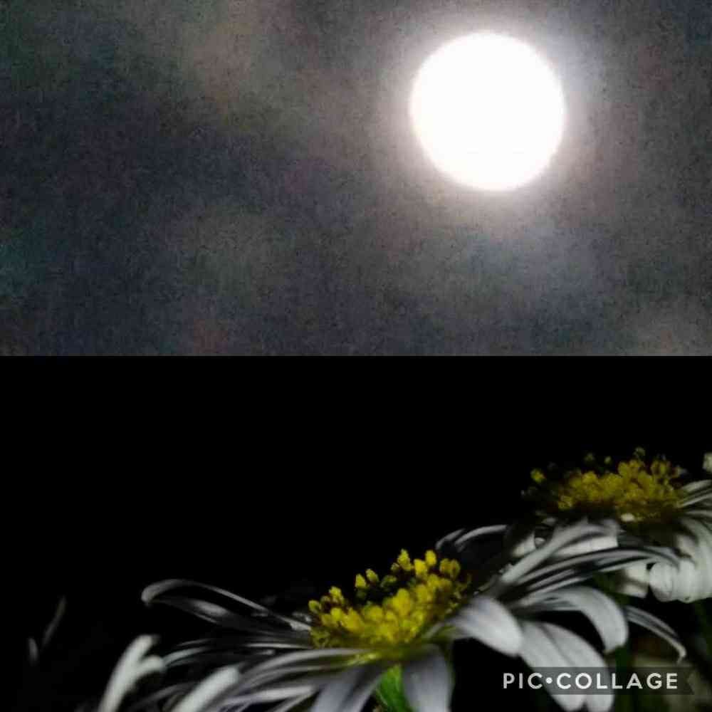 鉢植えのお花を片手で持ち上げスマフォのオス その中に月をいれたいんですが 収まらず 別々に撮ってコラージュしたと言うことです🎵