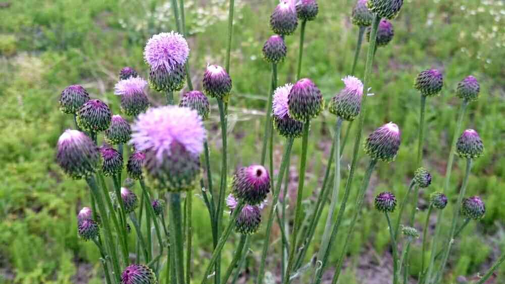 去年、畑にまいたキツネアザミの種があちらこちらで咲いてきました。