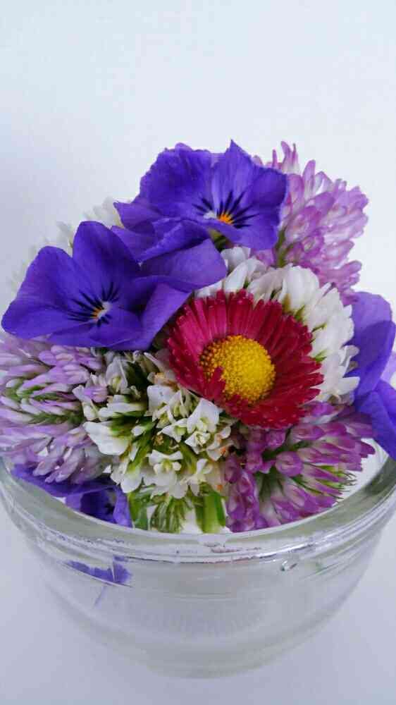 プランターのデイジーとビオラ、野原のシロツメクサとアカツメクサです。