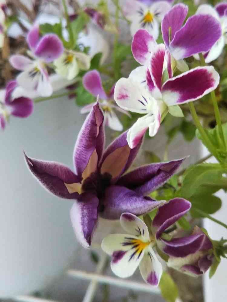 ビオラ🐰ラビットの中に 正体不明の挿し木クレマチスが しれ~っと 混ざりこんでる🌼