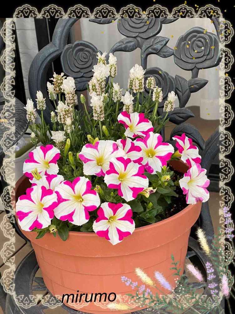 お花を乗せているのはイス❓薔薇さん🌹の模様が可愛い〜💕🎶