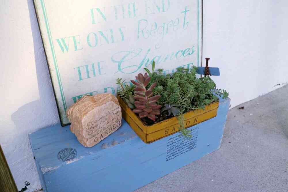 土台になってるやつはHCで100円で買ってきた端材😁ブルーにリメイクしてスタンプ打ちました‼ピンコロ石にもスタンプを❗多肉ちゃんのはいってる缶もクッキー缶。