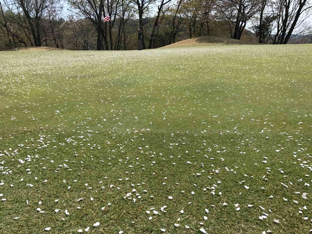 ゴルフ場のグリーン。桜の絨毯が素敵でした!自分のつけたマーカーの発見が困難でしたが。笑