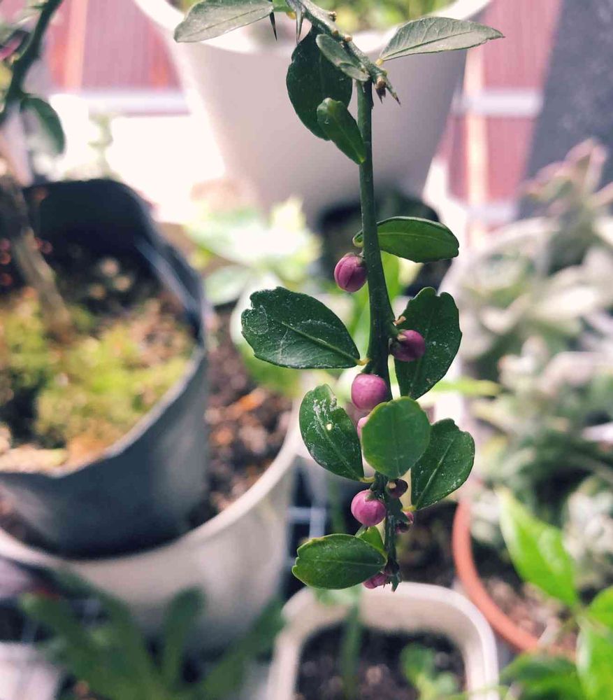 今年買ったグリーンのフィンガーライムに蕾がついた。