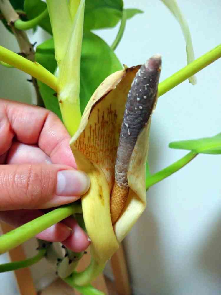 先日見つけたフィロデンドロン・マレービューティーのつぼみのようなものが、花が咲くのを見る前に枯れてきたので、中を開いてみたらサトイモ科の花と同じ形をしていて、やはり花だったようです。