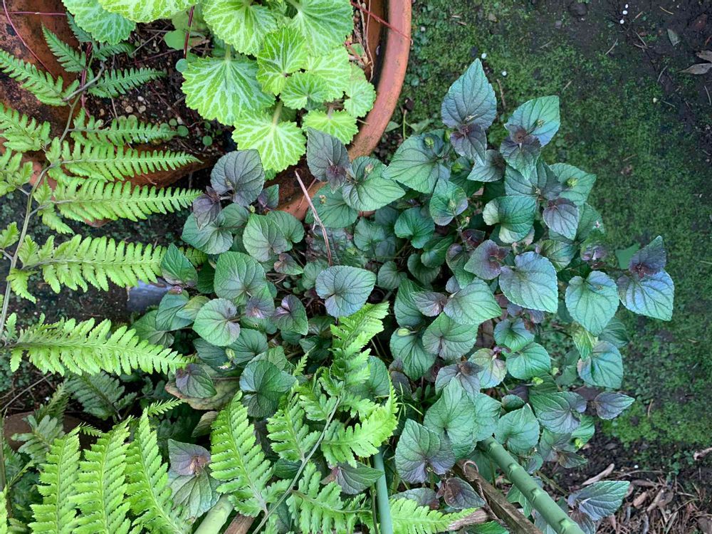 雨で苔むした土に割れたテラコッタの残った土の部分に広がったユキノシタ、シダも植えた覚えはないけど自然に生えてきます🌿ビオラ ラブラドリカはおそらくクレマチス プリンセスケイト(端っこに支柱が写ってるので)の鉢の足元に自然に増えたもので、寒い時は銅葉だったけど、暖かくなりグリーンに変わりつつある、なんともステキな色をしています💕
