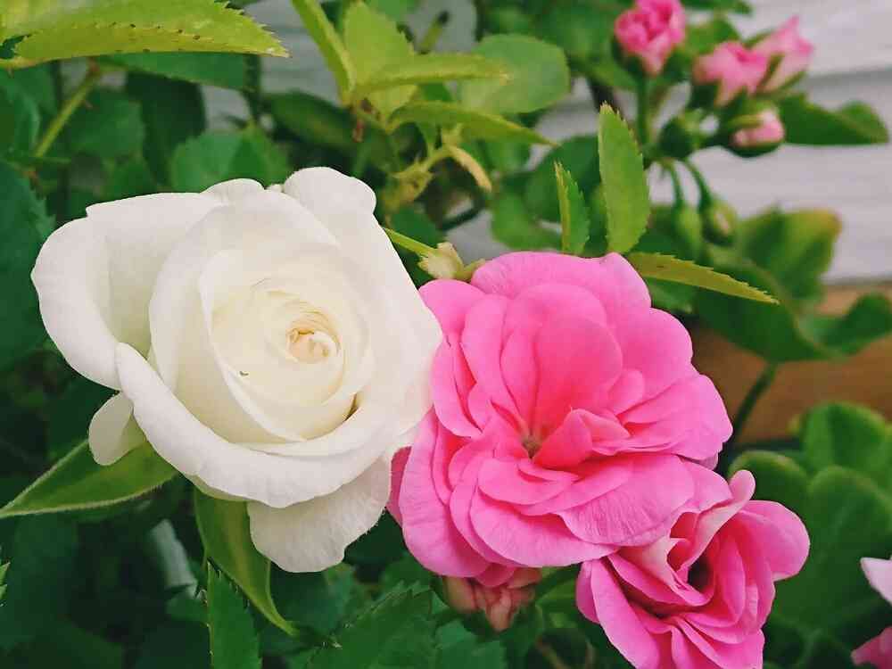 ミニ薔薇さんとゼラニウムさんの花の大きさが同じで、仲良しの恋人みたいで、微笑ましいですね❤️可愛い💕
