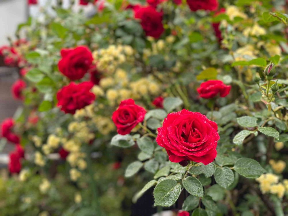 真紅の薔薇とモッコウバラで目隠しを兼ねたガーデニングが美しくて、いつも見惚れちゃう♡