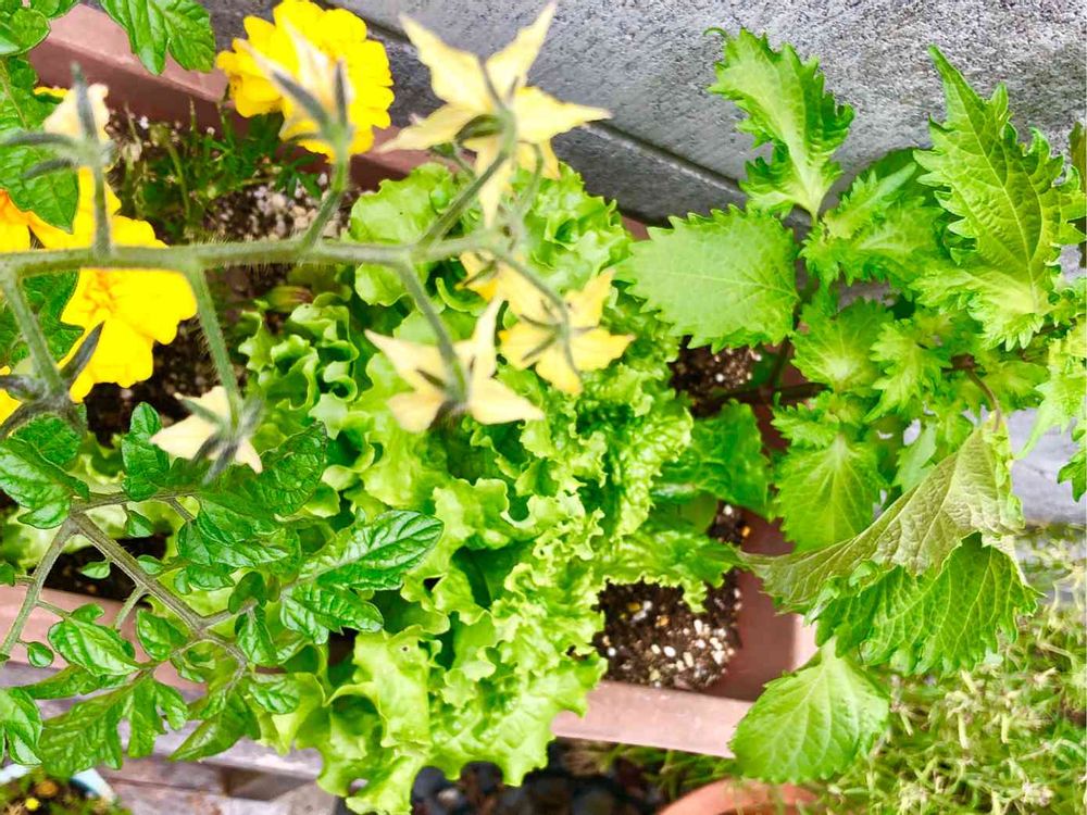 ミニトマト、マリーゴールド、リーフレタス、大葉を一つのプランターで育ててます。