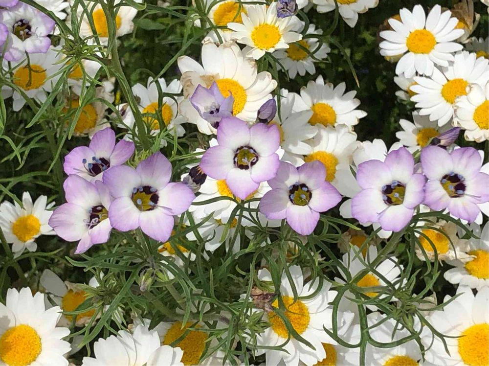 ノースポールに埋もれてしまったギリア・トリカラー(トリコロール)です。淡い紫色のグラデーションがステキです💜。