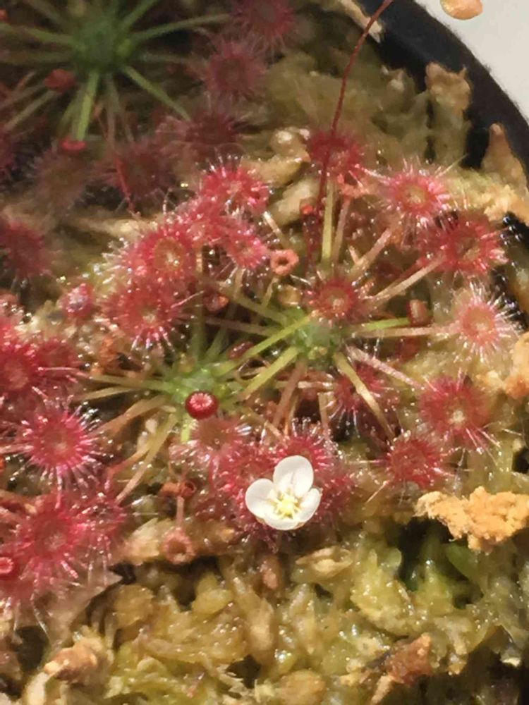 うちにあるピグミードロセラたち、いつも平日の午前中、自分が出勤した後に咲いて、帰って来た時には完全に萎んでしまっているので、花が咲いてるのを見ることは滅多にありません。。
