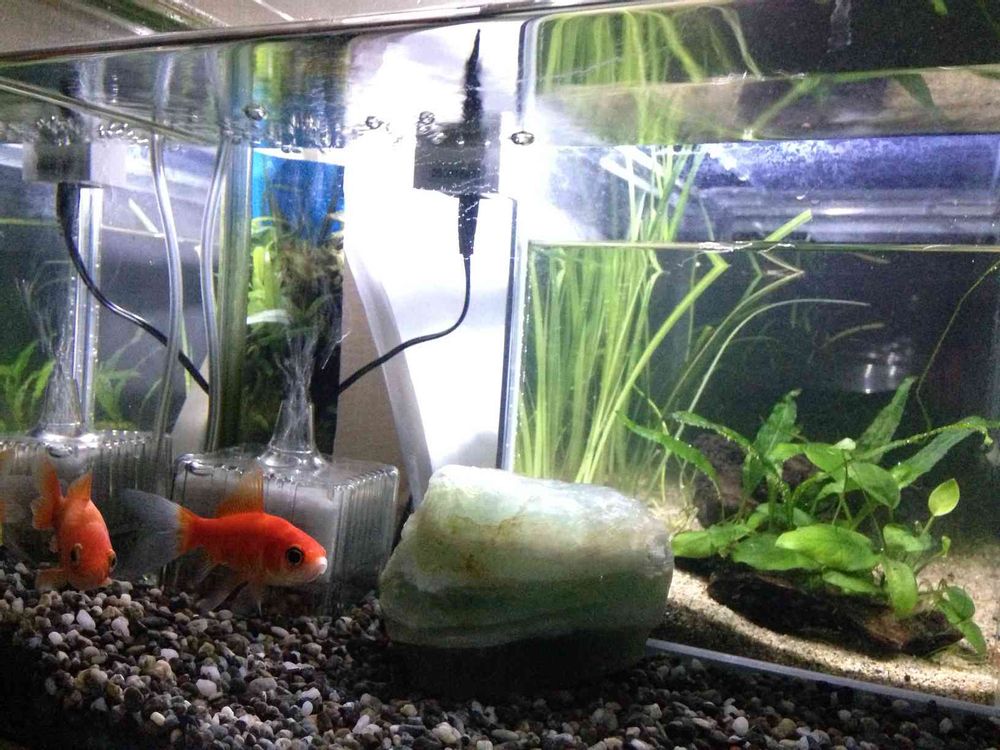 掬った金魚🐟、玄関の水槽🌱で泳いでま〜す。