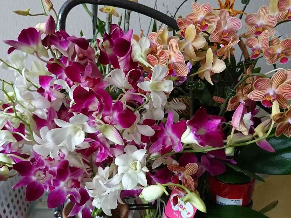 先日我が街のJAにスナップエンドウを買いに行った時にあれやこれやとお買得品を漁った時に写真左側のお馴染みのデンファレの切り花10本が税込110円になってまして、2束20本お買上。病人の布団を剥ぐようなお値段でした。