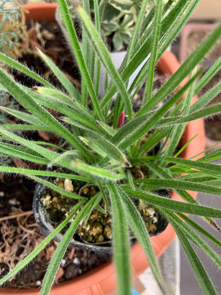ピンクの花の蕾があり、細い葉っぱに毛が生えてます