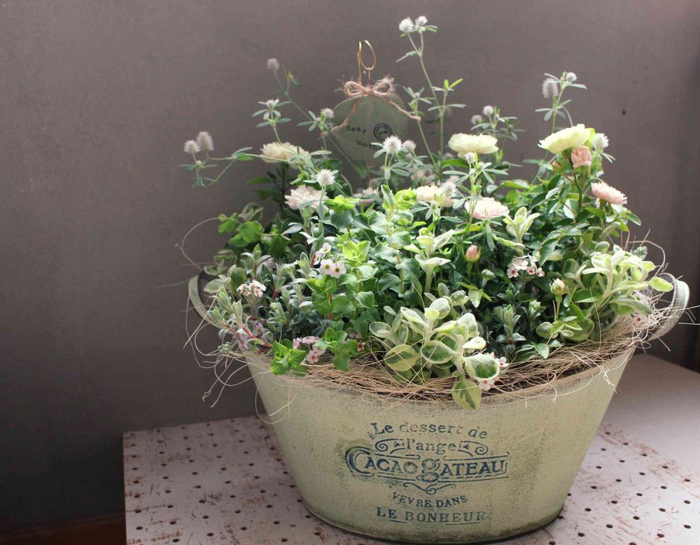 母の日用の寄せ植え。グリーンアイスをメインに野原のようなイメージで。
