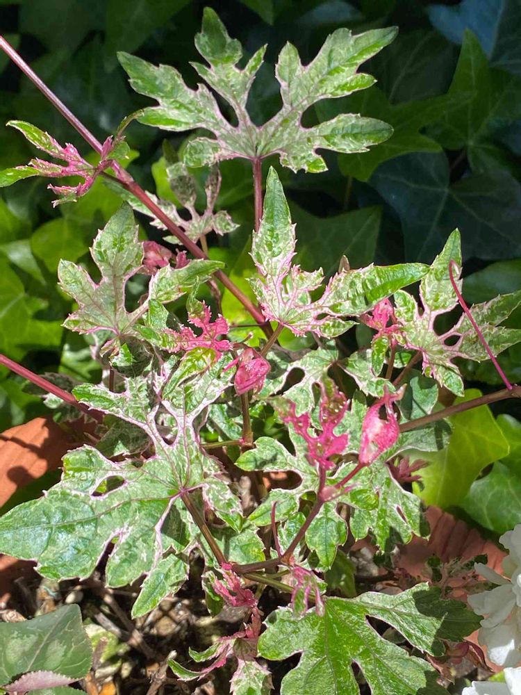 寄せ植えの鉢から赤い新芽🌱が出てきて葉は面白い形で白い毛がふわふわついています。