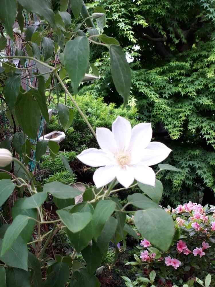 白いクレマチス、年々花が、小さくなってきました。栄養不足?😓今日も、仕事🚙💨頑張ってきます。☔