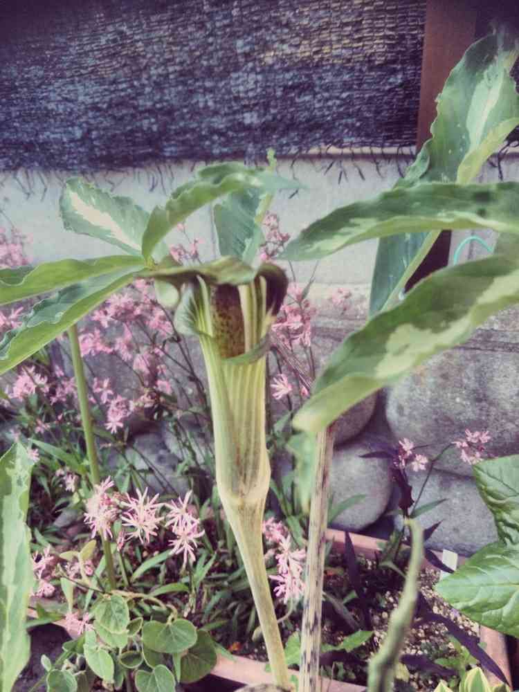 マムシグサの下に咲いている可愛い桜色の花は何ですか?